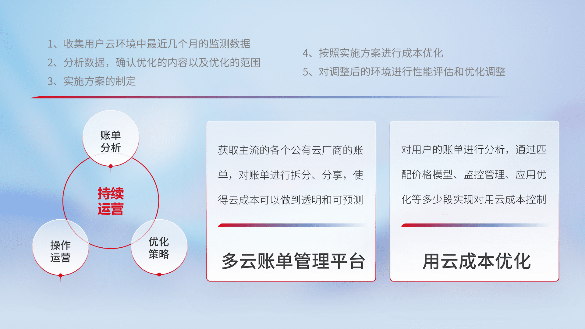 通过多云纳管,,以统一的资源数据模型把客户的云资源进行抽象和封装,,,进而实现对多云资源的统一操作,,,保障云资源管理的可靠性、、稳定性与可用性。。。。量身定制化运维内容,,,配置、、、、开发运维、、补丁管理、、、备份、、、、监控、、认证和访问管理、、、审计和日常巡检等,,,,保障在用云过程中的可靠度,,稳定度以及高可用率。。